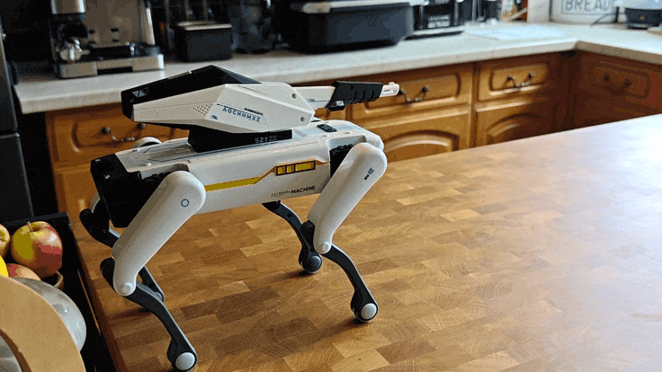 Según la página del producto, la torreta trasera de Clippy "puede cargarse con balas de gel para lanzarlas por diversión". La imagen que acompaña esta descripción es impresionante: dos proyectiles azules parecen salir disparados del cañón. Inmediatamente me imagino a un perro vigilante robótico, autónomo, patrullando la casa, buscando amenazas e impartiendo rectitud.